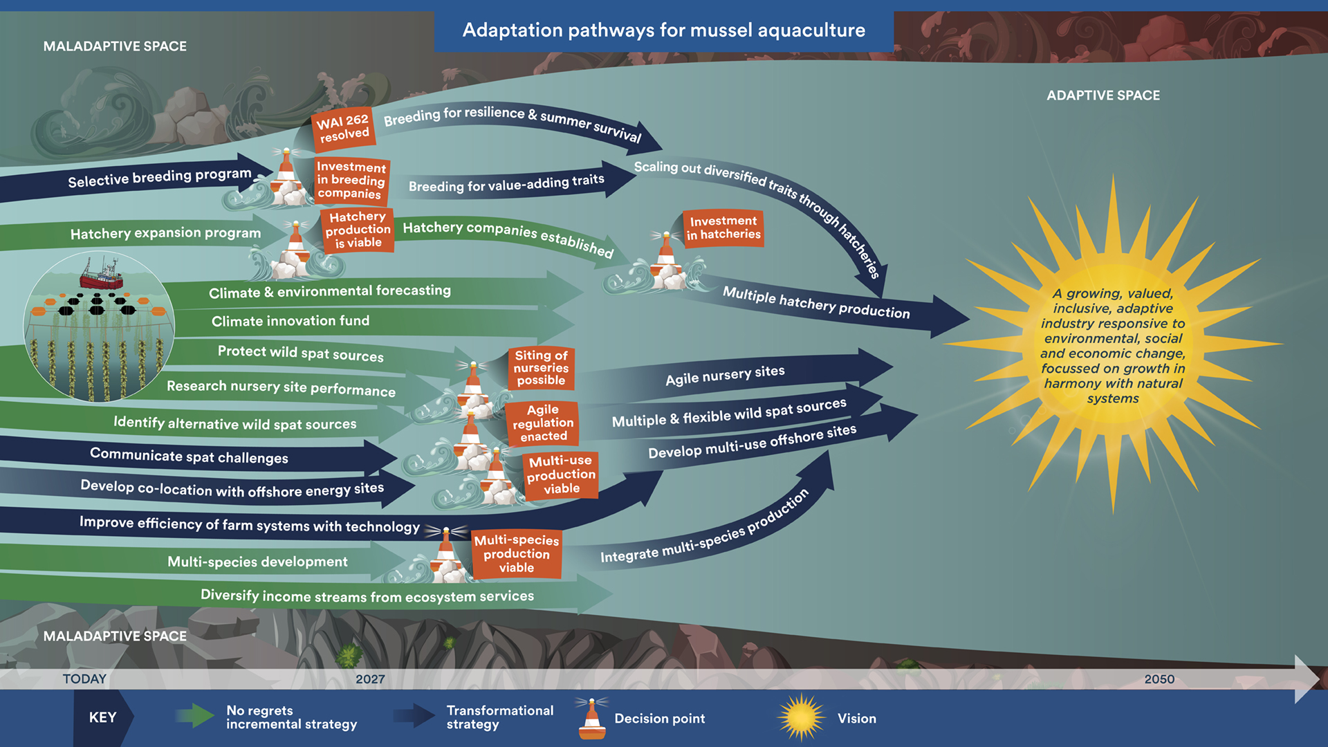 This comprehensive and impactful suite of resources was developed to guide decision making and adaptation across the sector and within individual organisations. This collaborative work is the result of a shared vision for a thriving marine environment, blue economy and seafood community for Aotearoa New Zealand.